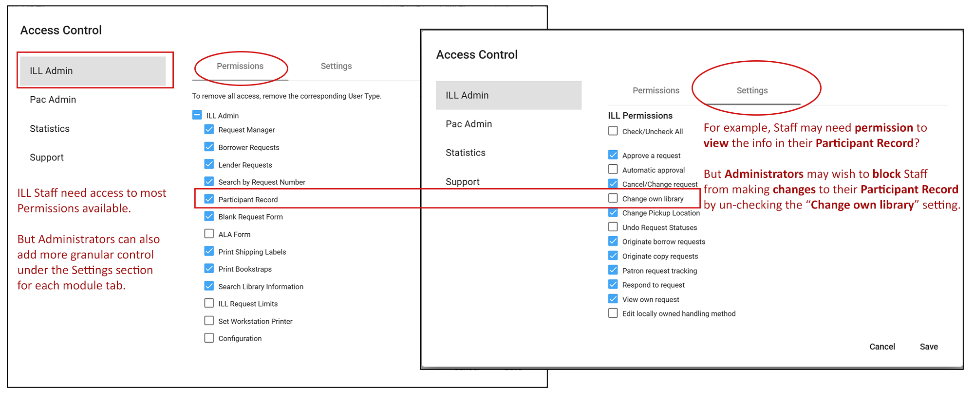 Questions related to user or library account permissions or settings including UX Admin, User Admin and ILL Admin's Maintain Participant Record.